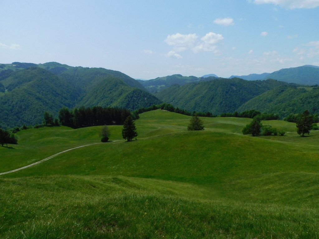 DOF hribovite krajine (vir: digitalni ortofoto, Geodetska uprava Republike Slovenije, januar 2024): Polhograjsko hribovje Z od Polhovega Gradca – prevladujejo gozdovi ter travniki in pašniki. Morebitni razpršeni manjši sadovnjaki in njive so neopazni.