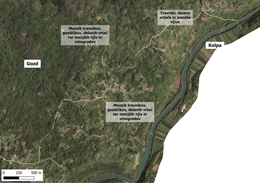DOF mozaične krajine belokranjskega ravnika (vir: digitalni ortofoto, Geodetska uprava Republike Slovenije, januar 2024): Preloka in okolica