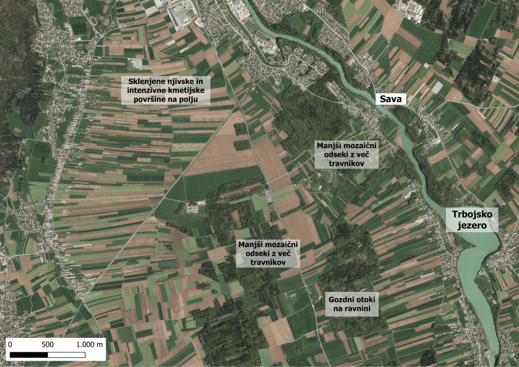 DOF ravnine in bolj enovite krajine (vir: digitalni ortofoto, Geodetska uprava Republike Slovenije, januar 2024): Kranjsko-Sorško polje