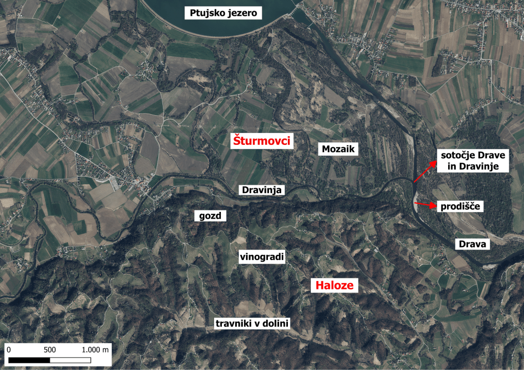 DOF mozaične krajine nižine (ravnine) in gričevja (vir: digitalni ortofoto, Geodetska uprava Republike Slovenije, januar 2024): Krajinski park Šturmovci, sotočje Drave in Dravinje ter sosednja bližnja okolica Haloz