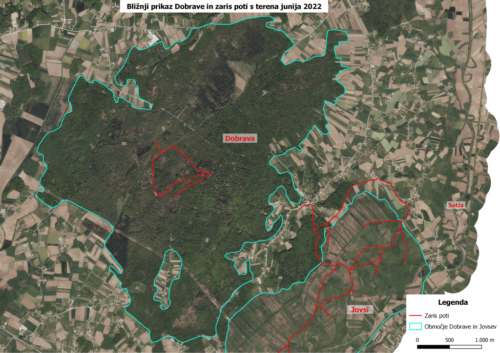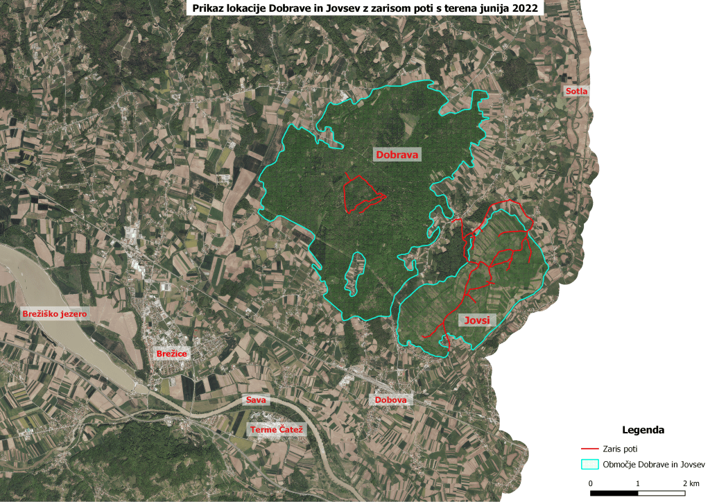 Karta lokacije Dobrave in Jovsev z zarisom poti s terena junija 2022 (vir podlage: digitalni ortofoto, Geodetska uprava Republike Slovenije, november 2021)