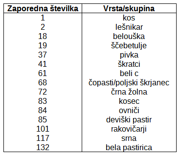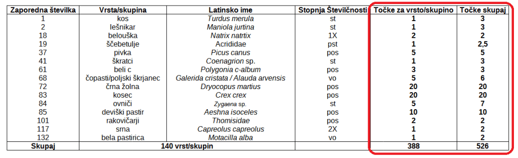 Seznam izbranih živalskih vrst in njihovo točkovanje