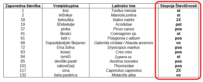 Primer terenskih rezultatov – pripis številčnosti vrstam